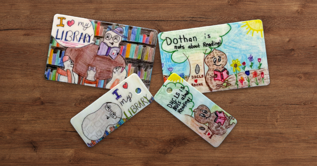 Young artists’ designs from Allegany County Library System, fully booked with creativity and brought to life as library cards and key tags. Check out their Summer Reading Fundraiser!